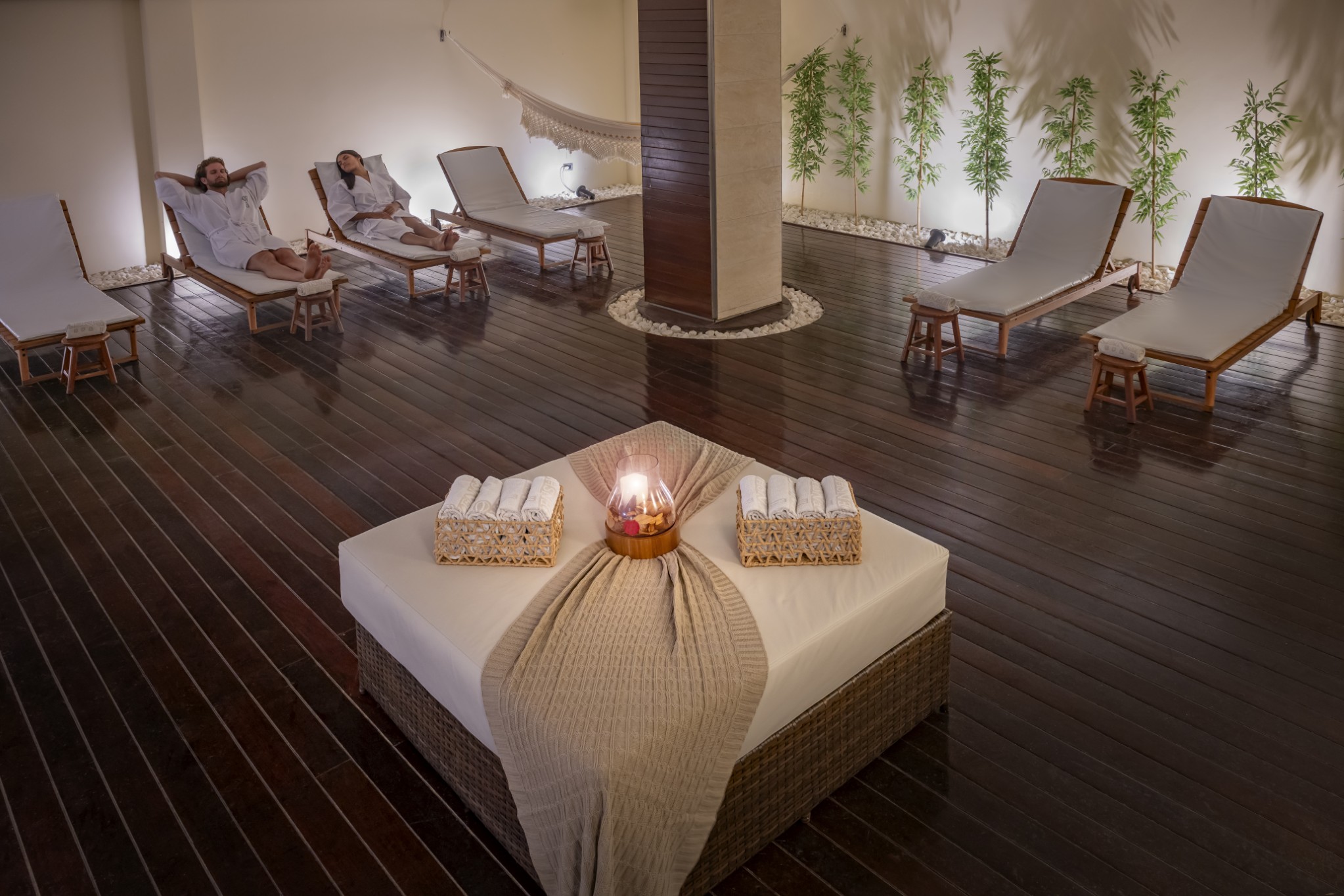 Trazendo essa filosofia para o bem-estar, o spa oferece 940m² dedicados ao relaxamento, com sala de espera, sete salas de terapias (incluindo uma exclusiva para casais) e um circuito das águas completo, composto por piscina coberta e climatizada, hidromassagem com cromoterapia, duchas holandesas e saunas seca e a vapor.