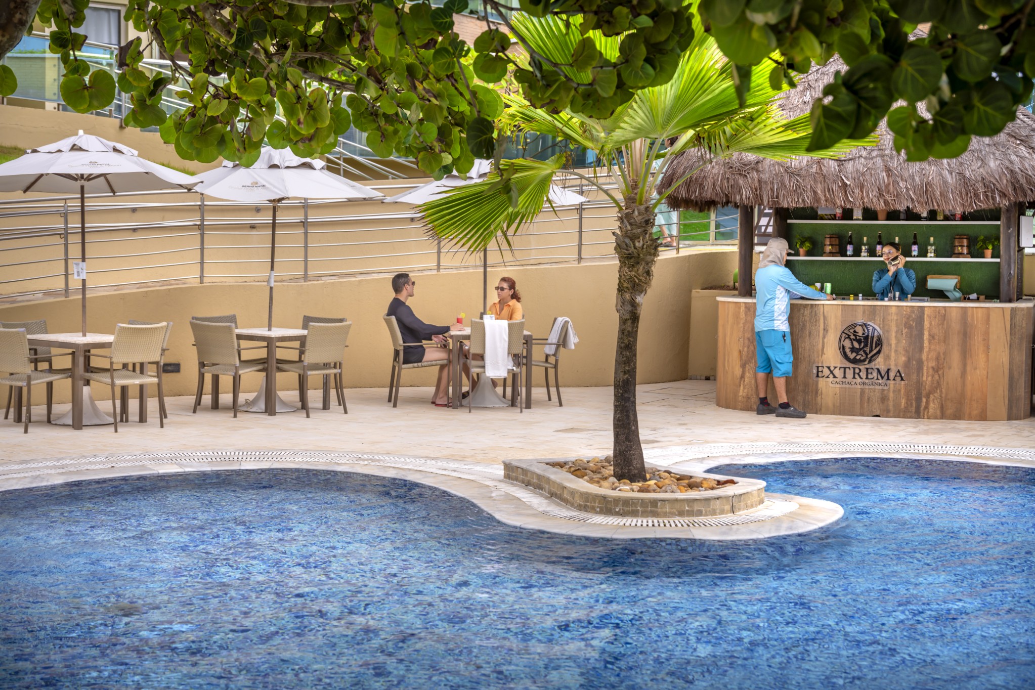 À beira da piscina, a Cachaçaria Extrema é o ponto de encontro perfeito para quem aprecia bons momentos em um ambiente leve e convidativo.