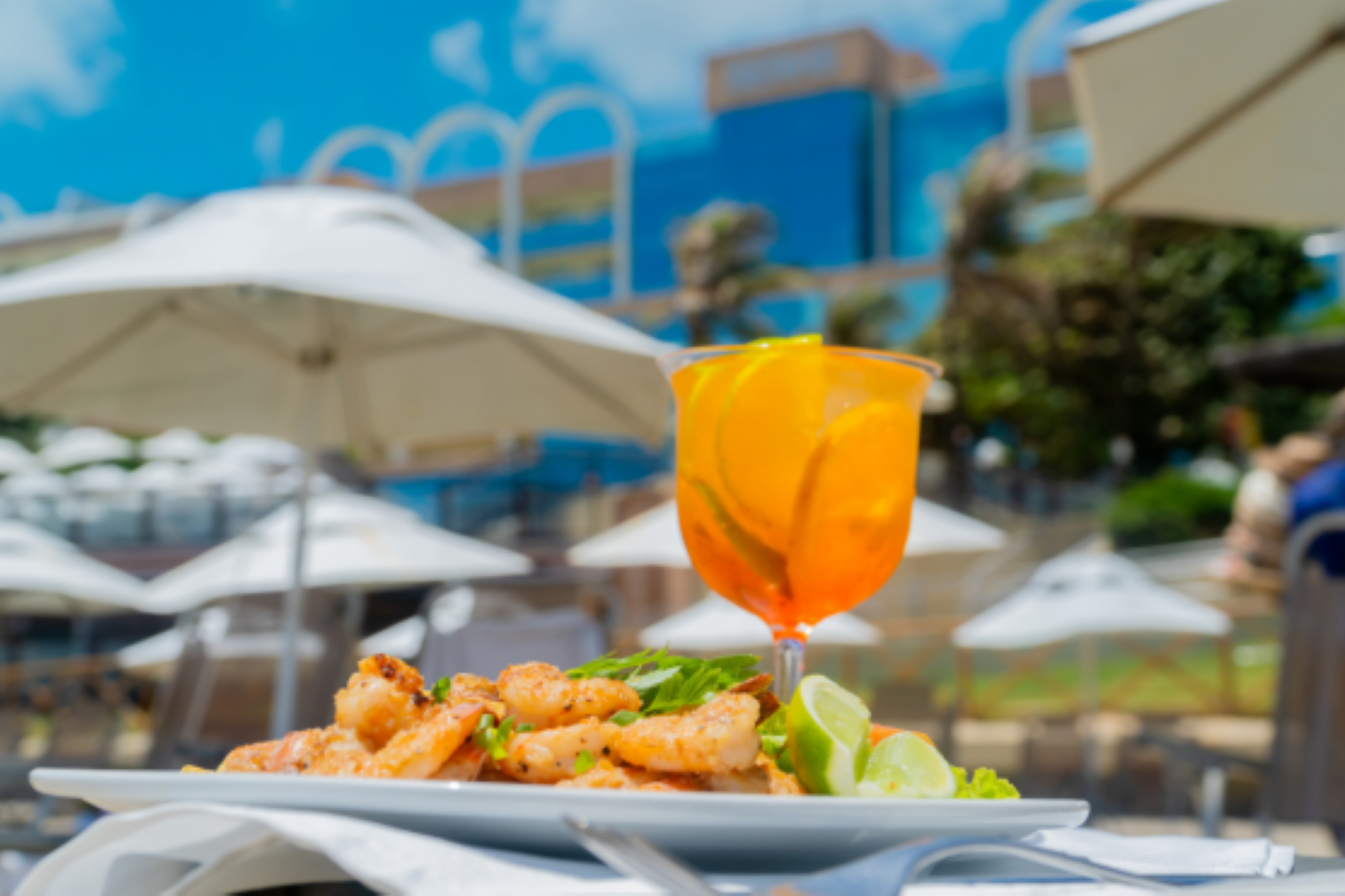 Entre coquetéis exclusivos, sucos naturais e água de coco gelada, o espaço convida a relaxar sob o sol, sentir a brisa e aproveitar cada momento com conforto e comodidade.